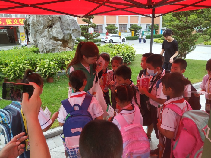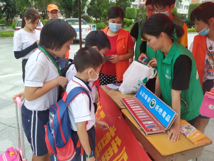 班會課后,云衢小學的家委參與到禁毒辦社工的禁毒宣傳工作中,他們在云衢小學學校文化石旁擺起了攤位,派預防毒品的宣傳單張,社工和家委們向學生們講解和認識毒品知識,向學生提問,回答正確的可以得到禮品,學生們樂于參加這種宣傳活動,效果非常不錯。