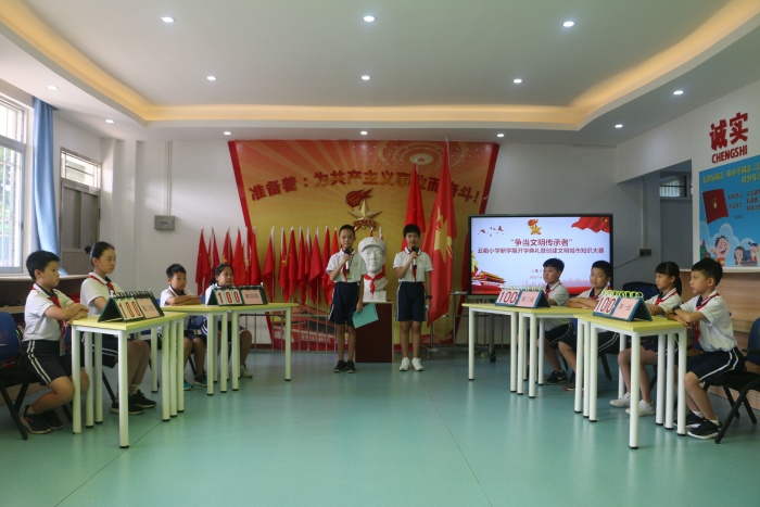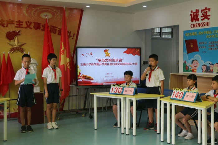 隨后,全體師生觀(guān)看了云衢小學(xué)少先隊(duì)“爭(zhēng)做文明傳承者”創(chuàng)建文明城市知識(shí)大賽。本著“我知曉、我參與、我奉獻(xiàn)、我行動(dòng)”的宗旨,參賽隊(duì)員們積極準(zhǔn)備,熟記題庫(kù),積極參與,你爭(zhēng)我搶的回答、擲地有聲的聲音,場(chǎng)面十分熱鬧。觀(guān)賽的隊(duì)員也感染了起來(lái),不停地喝彩。
