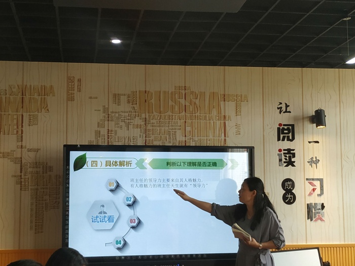 阮副校長從分享自己閱讀《提升班主任領導力》這本書開始,采用拋磚引玉的方法,激勵老師們去讀書,鼓勵班主任們做一個有自主追求的班主任。她先對這本書進行了具體的解析,然后用判斷對錯的辦法讓班主任判斷此種行為是對或者錯,還用具體的案例、具體的處理方法,讓班主任們分別進行評價,也總結出幾種搜集素材的方法,讓班主任們受益匪淺。