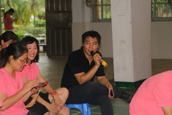 團康活動有3個項目,分別是同心擊鼓、趕球競速和幸福織網。同心擊鼓是最具難度的一個項目:一人拉一根繩子,人數少就一人拉兩根或三根繩,然后一齊把鼓支撐起來顛球,在3分鐘內哪組連續顛球最多的為勝,第一名6分,第二名5分,如此類推。此活動是最考驗集體的專注度和配合度的:有的繩子沒有拉緊,鼓面下垂,不夠張力,球怎么也顛不起來;有的配合度不夠;有的還沒找到竅門……趕球競速最有趣:因為是用用一支塑料棒趕著軟球跑,塑料棒不好使力,球也不聽使喚,笑料百出……