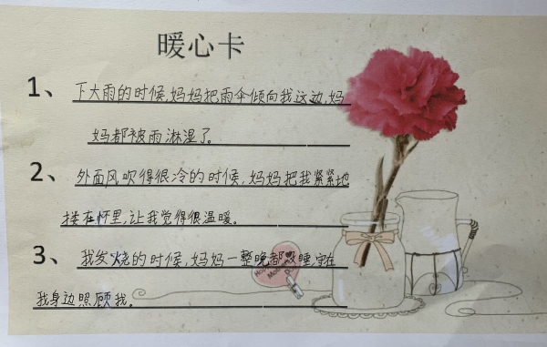 活動三:表達(dá)愛。母愛如春夜無人知曉的細(xì)雨,如黃昏穿過林間的晚風(fēng),如清晨的每縷陽光,陪伴在你不經(jīng)意的時候。母愛是悄無聲息的,在感受愛的同時,云小的隊(duì)員也善于表達(dá)愛。隊(duì)員們紛紛制作一份暖心卡,把媽媽做得最暖心的3件事寫下來。同時,為媽媽獻(xiàn)上親手制作的一份小禮物和節(jié)日的祝福。