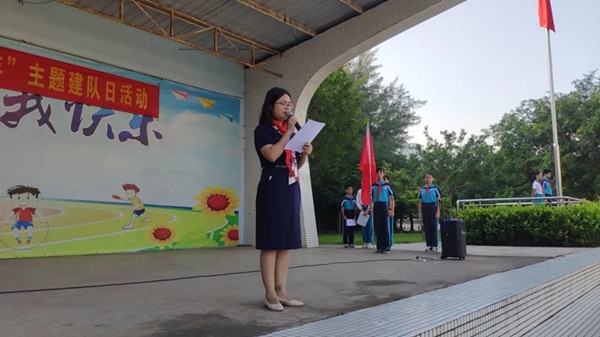 早晨,伴隨著冉冉升起的太陽,全體師生在操場舉行升國旗儀式,國旗在莊嚴的氣氛中徐徐升起,在隊員們的嘹亮的國歌聲中飄揚。升旗儀式結束后,由四1中隊進行主題為《隊知識教育》的國旗下講話,隊員們在聽的過程中重溫隊知識。接著學校大隊長帶領中隊長進行出隊旗儀式,全體少先隊員行隊禮,唱隊歌。隊歌結束后,學校少工委主任向全體隊員傳達了《習近平總書記致中國少年先鋒隊全國代表大會的賀信》精神,少先隊代表給隊員們講了先鋒故事,隊員們聽了雷鋒和鐘南山的故事后,受到很大的觸動。接著大隊輔導員就中國少年先鋒隊建隊71周年進行講話并帶領全體隊員呼號:準備著,為共產主義事業而奮斗,全體隊員回答:時刻準備著。呼號結束后進行退旗儀式,全體隊員敬禮。早上的活動由此結束。
