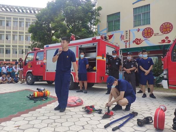 活動最后,消防員向同學(xué)們講解了消防車的構(gòu)造和功能、模擬消防車水槍參與滅火的場景。除此之外,現(xiàn)場示范和講解滅火器的使用步驟和注意事項,并由教師代表操作滅火器進(jìn)行現(xiàn)場滅火演練。