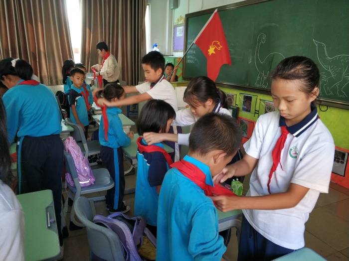 紅領巾是少先隊的標志,代表著紅旗的一角,是用無數革命先烈的鮮血染成的。良都小學少先隊大隊認真學習《少先隊改革方案》內容,組織隊干對低年級進行少先隊禮儀培訓,教低年級隊員系紅領巾。此外,良都小學少先大隊還開展了 “我是節約小能手”月餅盒回收活動,響應黨“厲行節約,反對浪費”的號召。各中隊輔導員則組織隊員開展“我和隊旗合個影”活動,向隊旗表達自己的敬意。