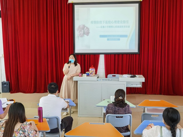 會上,吳麗歡主任首先對全體教師進行了主題為“疫情防控下返校心理建設指引”的心理健康教育培訓。她帶領所有老師溫習梁劍玲老師的講座《同心育人 用責守護》,從教師的自我關懷、各類學生的跟進輔導、具體問題的心理調適等方面進行詳細的講述,同時就老師發現心理異常學生應該如何處理的步驟進行了非常清晰的講解。吳麗歡主任提出,復學之后,學生的心理健康應擺在第一位,教師要適當組織學生開展團康活動,用愛心和責任心迎接學生;另外,她還提出學生心理健康教育不僅僅是班主任、心理老師的工作,每位科任老師都應將學生心理健康教育放在重要位置。