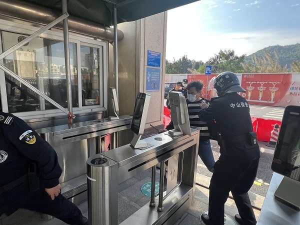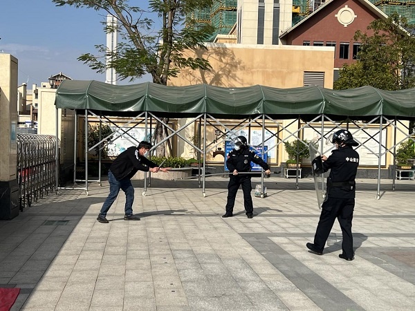 民警在依法對歹徒進行警告程序后,“歹徒”依然負隅頑抗。民警同志果斷實施警械制止,聯合學校保安人員將“歹徒”成功控制。