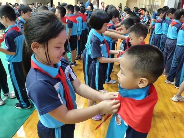 伴隨著嘹亮的隊歌,鮮紅的隊旗迎風飄揚,入隊儀式由此拉開了序幕。鮮艷的領巾,映紅孩子們稚嫩的臉龐;火紅的隊旗,帶領隊員大步前行。老隊員們在隊旗下給新隊員系上紅領巾,希望新隊員們能秉承光榮傳統,做紅色基因的傳承者。
