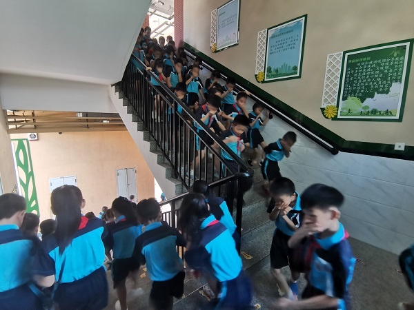 演練前,各班主任對(duì)學(xué)生進(jìn)行了消防安全教育,提醒學(xué)生有秩序地從走廊、樓梯右側(cè)低頭、彎腰、捂口鼻地撤離教學(xué)樓,到操場(chǎng)匯合。