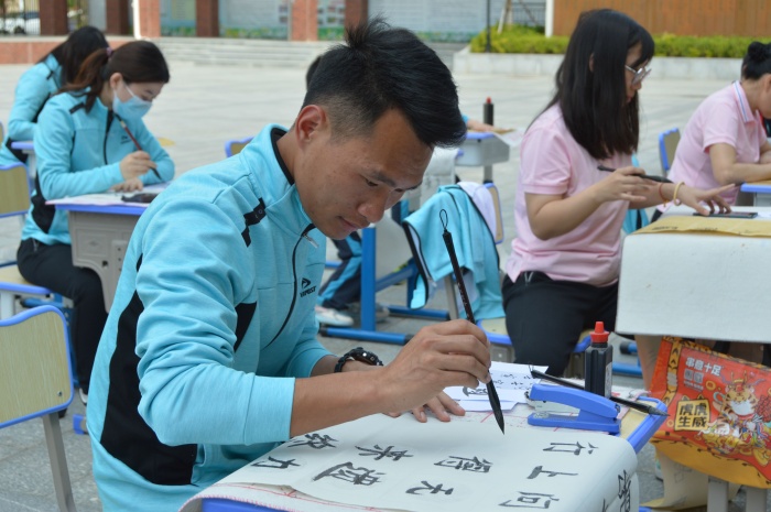 師生們聚精會神執筆書寫,全身投入。執筆指實掌虛,運筆中鋒鋪毫,點畫意到筆隨,一筆一劃,一撇一捺,即成風范。在短短的四十分鐘內,一個個美觀的漢字從參賽者的筆尖流淌而出,一氣呵成。他們有的一筆一劃規范書寫,用剛正優雅的字跡詮釋做人的風骨;有的龍飛鳳舞,潑灑飄逸,用精美的筆鋒演繹美好的人生。而這游刃有余的背后,是堅持,是揣摩,是磨礪。