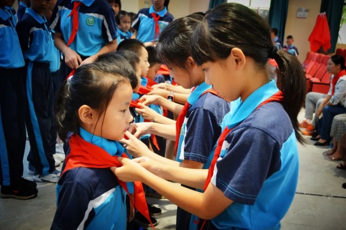 5月31日上午,伴隨著莊嚴(yán)的出旗儀式,少先入隊儀式由此拉開帷幕。隊會上全體隊員齊聲高唱《少年先鋒隊隊歌》,緊接著由大隊長宣讀新隊員名單。在激勵昂揚的隊歌中,五年級的老隊員為新隊員戴上了鮮艷的紅領(lǐng)巾。在莊嚴(yán)的隊旗下,學(xué)校少工委主任李向平向新入隊的少先隊員們表示熱烈的祝賀,同時也表達了對新隊員的美好祝愿。他希望少先隊員們爭做新時代“四有”好少年:有家國情懷的好少年、遵紀(jì)守法的好公民、勤奮好學(xué)的好學(xué)生、有良好品德的好孩子。愿孩子們茁壯成長、愿校園充滿歡聲笑語、愿祖國的未來更加美好!