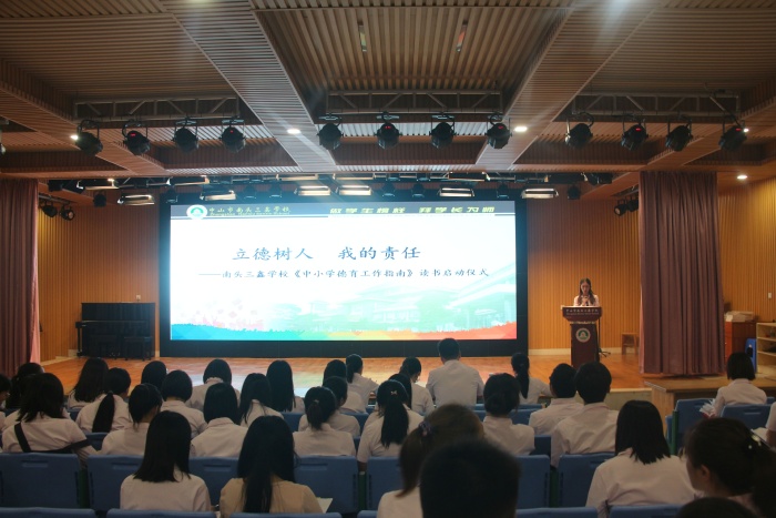 為了為深入貫徹落實立德樹人根本任務,加強對中小學德育工作的指導,切實將黨和國家關于中小學德育工作的要求落細落小落實,著力構建方向正確、內(nèi)容完善、學段銜接、載體豐富、常態(tài)開展的德育工作體系,大力促進德育工作專業(yè)化、規(guī)范化、實效化,努力形成全員育人、全程育人、全方位育人的德育工作格局,近日,中山市南頭三鑫學校舉行了“立德樹人,我的責任”為主題的《中小學德育工作指南》讀書啟動儀式,陳爾琪校長和鄧旭副校長在臺上為老師們頒發(fā)了德育書籍。