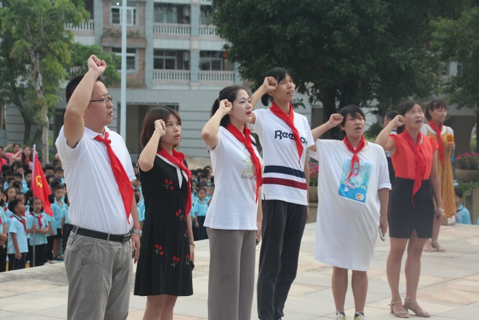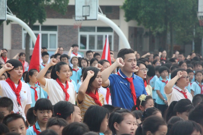 第三項,由大隊輔導員李曉宇宙學長帶領全體導師進行師德師風宣誓。在全體學生的見證下,老師們面向國旗,舉起右手,進行莊嚴宣誓:“我是一名光榮的人民教師。面對國旗,我莊嚴宣誓:忠于人民的教育事業,履行教師的神圣職責。愛國守法、以德育人;愛崗敬業、關愛學生,刻苦鉆研、嚴謹篤學;勇于創新、奮發進取;淡泊名利、志存高遠;教書育人、為人師表;團結協作、終身學習。為學校教育事業的全面發展、為中華民族的偉大復興、為人類文明的不斷進步,貢獻自己的全部智慧和力量!”