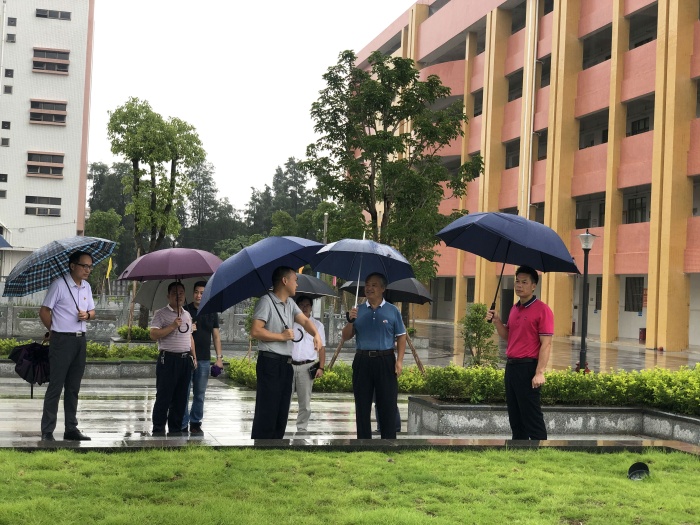 9月15日上午9時,南頭鎮黨委委員薛焯明,鎮宣傳辦公室(教體文旅局)主任(局長)姚華, 鎮教育和體育事務中心主任謝桂華,宣傳辦(教體文旅局)綜合股股長洪愛華和鎮文體教育局吳劍華老師一行五人冒雨到南頭鎮初級中學視察并指導工作。南頭鎮初級中學校長盧新泉、副校長梁紅令、副校長毛賢偉和學校總務處主任李忠漢全程陪同視察。