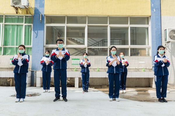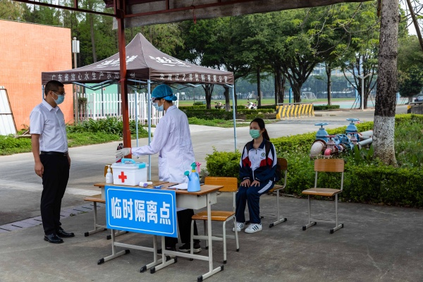 學校大門是校園疫情防控的第一道防線,故演練拍攝首先從學生進入校門開始。校門口拍攝包含了三個場景,一是學生戴口罩,按要求進行排隊,由教師測量體溫。二是有學生出現體溫異常,送至隔離區,由校醫進行復檢。三是學校老師或外來人員進入學校前進行粵康碼的掃描。為了呈現良好效果,需要不斷重復,但是,“學生”毫無怨言,只希望能為順利復學盡自己一份力。