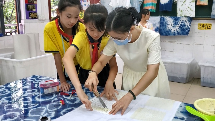 “擷撮采線結之,而后染色。即染,則解其結,凡結處皆原色,余則入染矣,其色斑斕”。這是對中國民間傳統染色技藝扎染的生動描繪,扎染是中國民間傳統的染色工藝。2006年扎染技藝經國務院批準,入選國家非物質文化遺產。2016年,南頭華暉學校將這項傳統工藝引進校園,開展扎染社團,2020年扎染進課堂,學生在日常學習中就能體驗扎染藝術的魅力,成為南頭華暉學校獨具特色的傳統工藝教學課程。