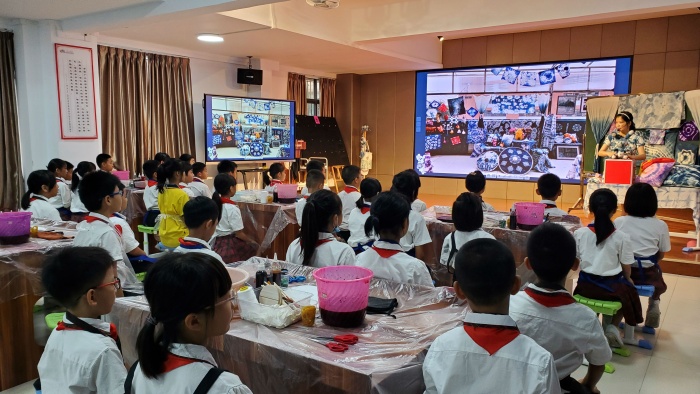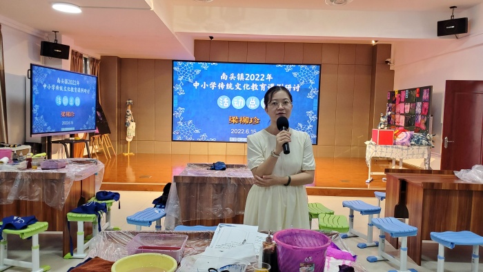 為了進一步貫徹落實教育部《完善中華優秀傳統文化教育指導綱要》和 《中山市教育和體育局關于落實<中山市傳承發展中華優秀文化實施方案>工作方案》的要求,加強南頭鎮傳統文化傳承與發展工作,6月15日下午,南頭鎮2022年中小學傳統文化教育課例研討活動在華暉學校舉行。參加本次活動的有南頭鎮教育和體育事務中心教研員梁柳珍老師,南頭鎮傳統文化科組中心組組長徐曉娟老師,以及各學校傳統文化教育負責人、鎮傳統文化工作室成員代表。本次活動主題為:“邂逅扎染之美,傳承非遺文化”。