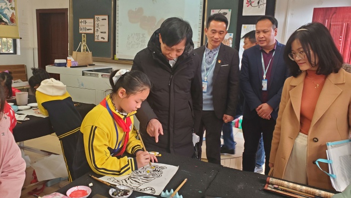 春寒料峭,熱情不減。陳主任和梁老師在李明勇校長等學校領導的陪同下參觀指導學校的毛筆書法、扎染、國畫等傳統文化社團活動,并與老師們親切交流。通過與陳主任和梁老師的交談,老師們均表示獲益良多。學校語文教研員謝顏老師展示了一節文言文課例《守株待兔》。課堂上,謝顏老師充分發揮學生的主導地位,把學習的主動權交給學生,孩子們落落大方的展示令聽課的老師贊嘆不已。