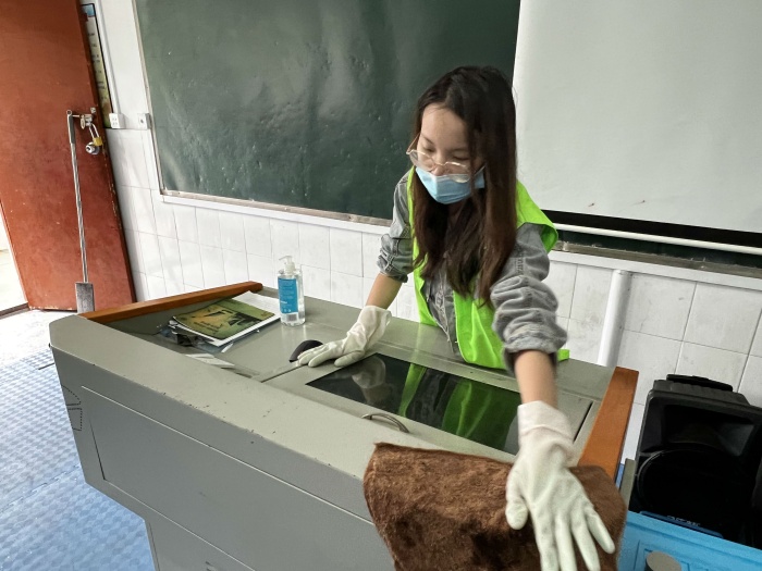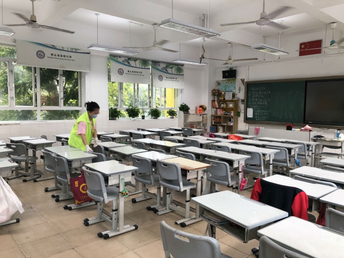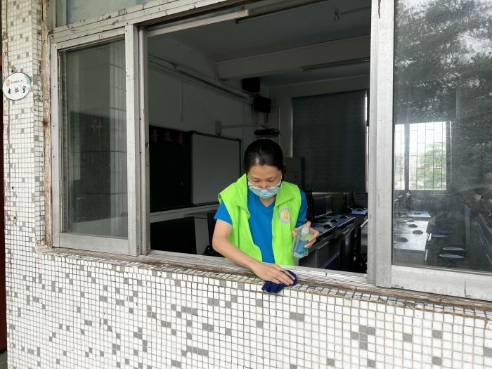 全體教師志愿者利用周末時間,一早回到學(xué)校,對各區(qū)域進(jìn)行集中整治清理。志愿者們對校門口周邊地帶、校園綠化帶、樓梯、走廊、教室、廁所、辦公室、實(shí)驗(yàn)室、器材室、圖書室等場所進(jìn)行認(rèn)真打掃清理,細(xì)致消毒,確保校園內(nèi)無衛(wèi)生死角,做到窗明幾凈,物品擺放整齊,無亂堆亂放現(xiàn)象。在勞動過程中,全體教師志愿者熟練地進(jìn)行消毒水配制,擦?xí)馈⒉链芭_、拖地,干得熱火朝天,充分體現(xiàn)了不怕苦、不怕臟的精神。經(jīng)過大家的共同努力,校園衛(wèi)生環(huán)境得到了進(jìn)一步的改善,整個校園面貌煥然一新。