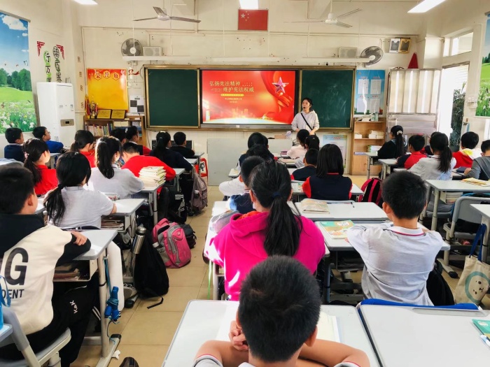 本次活動(dòng),班主任老師通過(guò)“憲法的地位、憲法的作用”向?qū)W生們闡明了憲法日設(shè)立的背景,讓學(xué)生初步了解:憲法是最高行為準(zhǔn)則,憲法是國(guó)家的根本法;憲法是治國(guó)安邦的總章程;憲法是其他法律的立法基礎(chǔ)等知識(shí)。隨后,班主任通過(guò)宣講“憲法日主題意義”,加深了學(xué)生對(duì)憲法及憲法日主題的認(rèn)識(shí)。在“如何弘揚(yáng)憲法精神”這一環(huán)節(jié),各年級(jí)通過(guò)各具特色的活動(dòng)激發(fā)學(xué)生學(xué)習(xí)憲法的熱情。低年級(jí)開展“我來(lái)講憲法故事”活動(dòng),讓學(xué)生聽著趣味橫生的憲法故事,從中懂得了憲法的意義;中年級(jí)開展“憲法知識(shí)競(jìng)賽”活動(dòng),使學(xué)生們鞏固了對(duì)憲法的認(rèn)識(shí);高年級(jí)開展“學(xué)憲法,講憲法”的演講比賽,更是使憲法精神深入人心。最后,班主任帶領(lǐng)全體學(xué)生宣讀憲法宣誓詞,從小樹立維護(hù)憲法權(quán)威的意識(shí)。