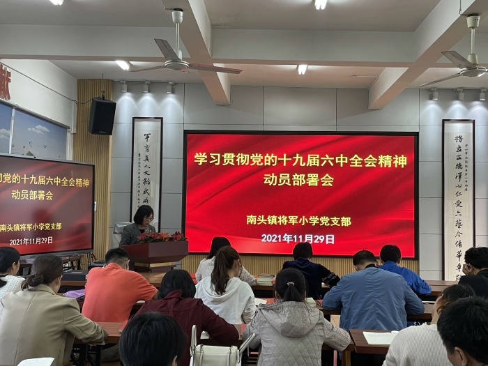 為認(rèn)真學(xué)習(xí)貫徹黨的十九屆六中全會精神,把黨史學(xué)習(xí)教育不斷引向深入,11月29日下午,南頭鎮(zhèn)將軍小學(xué)黨支部召開學(xué)習(xí)貫徹黨的十九屆六中全會精神動員部署會。本次會議由學(xué)校黨支部書記胡映芬校長主持,全體黨員參與其中。