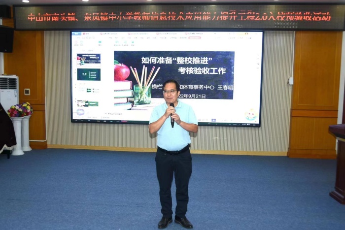 匯報(bào)結(jié)束后,何敏添主任對黃俊情老師展示的這節(jié)課例給予了充分的肯定,解讀了黃老師在課例中運(yùn)用到的信息技術(shù),并對應(yīng)到相應(yīng)的微能力點(diǎn),而且這樣操作能恰如其分地發(fā)揮信息技術(shù)的優(yōu)勢,助力教師與學(xué)生,打造更高效的課堂。同時(shí),也對這次課例教學(xué)設(shè)計(jì)的規(guī)范化撰寫進(jìn)行了指導(dǎo),建議在教學(xué)設(shè)計(jì)中明確教學(xué)環(huán)節(jié)中運(yùn)用的信息技術(shù)及其作用作出相應(yīng)的說明。并就匯報(bào)學(xué)校提交的整校驗(yàn)收的資料,對照《能力提升工程2.0“整校推進(jìn)”績效考核指標(biāo)體系(中山)》詳細(xì)的介紹了各項(xiàng)資料上交中存在的問題及相應(yīng)的規(guī)范化操作方法。橫欄鎮(zhèn)教育和體育事務(wù)中心王春明主任從整理材料清單、明晰考核要點(diǎn)、熟悉考核流程、關(guān)注考核細(xì)節(jié)四個(gè)方面對學(xué)校準(zhǔn)備“整校推進(jìn)”考核驗(yàn)收工作進(jìn)行指導(dǎo)。著重對“一劃兩案”的正確填寫逐項(xiàng)進(jìn)行剖析與指導(dǎo)。強(qiáng)調(diào)要在態(tài)度上重視,在細(xì)節(jié)上下功夫,以特色來獲勝。