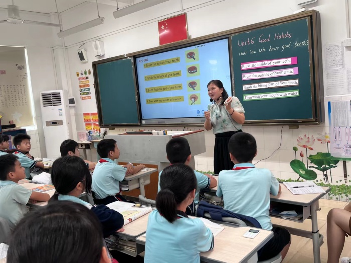 語文科組的吳敏施老師和英語科組的肖雪芳老師分別上了一節趣味橫生的語文和英語展示課,旨在通過“愛種子”模式教學的展示課,促使教師們不斷吸收先進的教育思想和新的教學方法,促進教師教學思維轉變,提升教學能力。兩位老師嫻熟地向大家展示了“愛種子”教學模式在課堂中的運用,將課堂大部分時間還給學生進行自主學習和合作探究,讓學生大膽發言與展示,課堂氣氛活躍,學生互助合作效果顯著。在語文課《童年的水墨畫》中,吳老師帶領3年2班的孩子通過組建學習共同體開展自主學習,并通過豐富的活動設置,引導學生有感情地朗讀和品味課文,精心準備的課例將孩子們置身于美好的課文情境中。肖老師在五年級英語課例《Unit6 Good Habits -How can you have good teeth》中,則通過愛種子答題器等采集數據,通過數據分析進行精準教學,并設置了開放式的問題,形成問題鏈來開展主題拓展,創設表演等任務,幫助學生進行知識的遷移,引導學生主動探究、思考問題,提高學生語言運用能力。