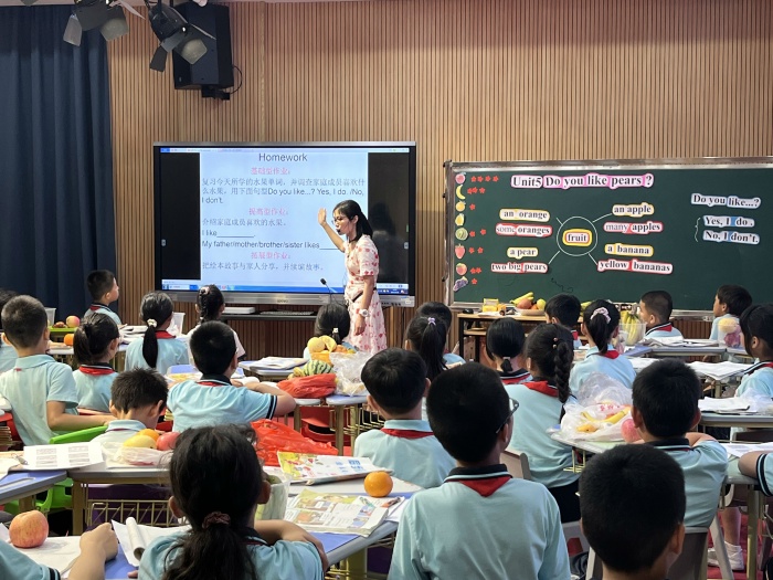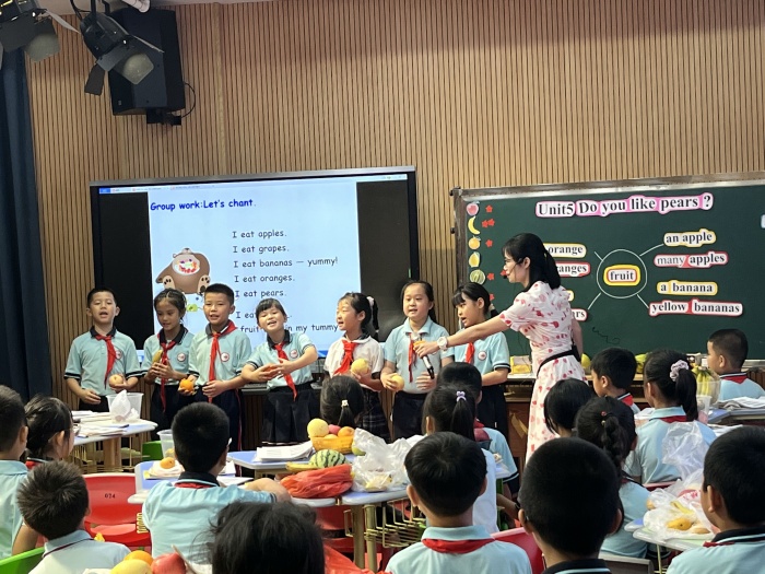 本次研討活動圍繞南頭鎮民安小學英語科組盧麗萍老師的課例展開,盧老師上課內容是人教版三年級下冊unit5《 Do you like pears?》Part A Let’s learn&let’s chant,盧老師緊扣教學重難點,有效整合智慧平臺上的豐富資源,設計了豐富多彩的聽、說、讀、寫等語言活動。學生們在體驗、練習和交流中習得語言;在任務驅動下進行小組合作探究并運用語言;通過繪本閱讀拓展知識和深化語言。整堂課教學內容充實,教學環節緊密相扣,層層遞進,學生們全程投入其中并大膽表達自己的想法。