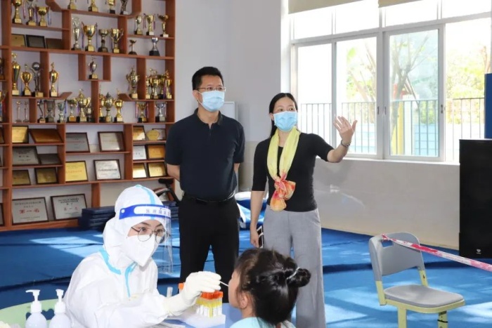 根據(jù)中山市新冠肺炎疫情防控指揮部的統(tǒng)一部署,3月21日,南頭鎮(zhèn)對(duì)鎮(zhèn)內(nèi)中小學(xué)校、幼兒園師生員工共計(jì)19000余人開展全員核酸檢測(cè)。21日下午,鎮(zhèn)黨委副書記、鎮(zhèn)長藍(lán)海斌來到南頭鎮(zhèn)民安小學(xué)校園全員核酸檢測(cè)采樣現(xiàn)場(chǎng),調(diào)研疫情防控工作。副鎮(zhèn)長肖彥余、教體局負(fù)責(zé)人陪同調(diào)研。