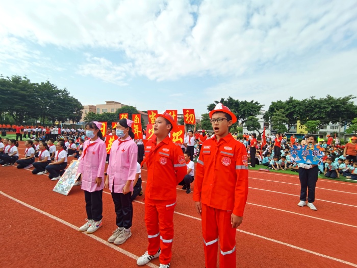活動第一項是本次體育節(jié)暨田徑運動會的開幕式。南頭鎮(zhèn)教育和體育事務中心主任謝桂華、體育專干黃再玲老師、藝術專干姚利芳老師,南頭鎮(zhèn)關工委副主任黃祺宗、梁細言委員、何華嬌委員、梁映娟委員到現(xiàn)場觀看入場式。首先是進行入場儀式,隨著運動員進行曲的響起,國旗隊、隊旗隊以及各班級方陣在主持人激情洋溢的解說中入場。孩子們矯健的步伐,鏗鏘有力的班級口號,方陣隊的展演精彩紛呈、震撼人心,有致敬快遞小哥、物流司機、社區(qū)疾控、公安民警、消防官兵、抗洪戰(zhàn)士、醫(yī)生、白衣天使、送菜農(nóng)民、火神山雷神山醫(yī)院建設工人、北斗導航工程師、5G技術人員……學生身著各個職業(yè)的服裝,將英雄的故事展演,向偉大的時代英雄致敬!全校二十八個班級精神抖擻,神采飛揚,排著整齊的隊伍依次入場,充分展現(xiàn)了民安小學師生的蓬勃朝氣和青春活力。最后進場的是民安小學家長義工隊方陣,他們?yōu)榧倚D軌蚋玫暮献鞲冻隽瞬恍傅呐Α?/p>