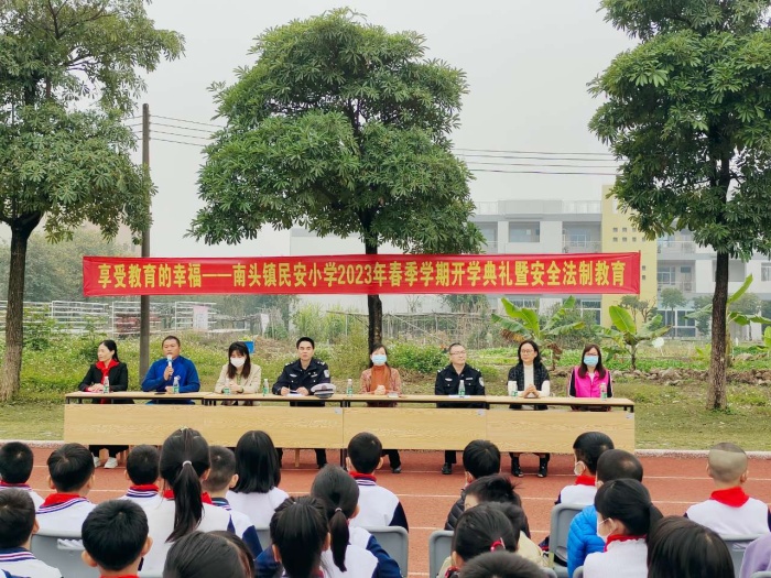 春風(fēng)和煦,草長(zhǎng)鶯飛。沉寂了一個(gè)寒假的校園又被同學(xué)們的歡笑聲打破,帶著新的心情、新的希望、新的目標(biāo),又迎來了新的學(xué)期。2023年2月6日上午,南頭鎮(zhèn)民安小學(xué)舉行了2023年春季新學(xué)期開學(xué)典禮暨安全法制教育。