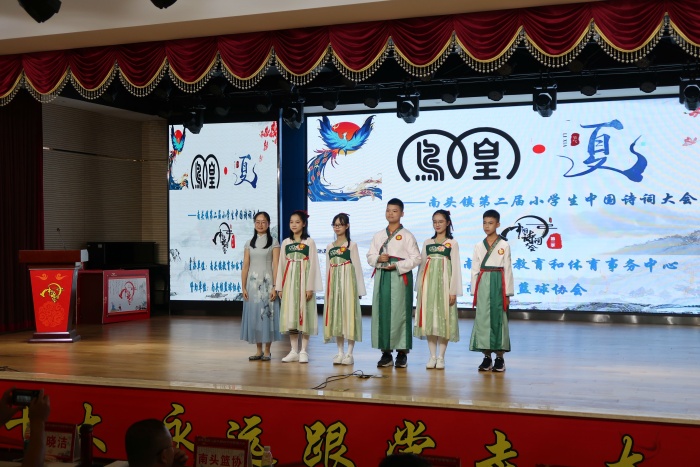 賽前,由南頭鎮中心小學帶來一場精彩紛呈的表演。接著正式進入比賽,首先進行的是團隊角逐賽,6所學校的代表隊分別閃亮登場,他們身穿漢服,昂首闊步,一支支隊伍熱情高漲,神采飛揚,以別出心裁的亮相展示了斗志昂揚的良好風貌,表達了自己必勝的決心。第一輪的比賽,題型包括九宮格拼古詩、逆向接句、詩詞理解、圖畫(詞語)聯想、情景運用,還融入了黨史學習教育,從多方面考查選手的詩詞水平。賽場上,選手們既緊張又沉穩,答對時,興奮之情溢于言表;失誤時,又懊惱無比。