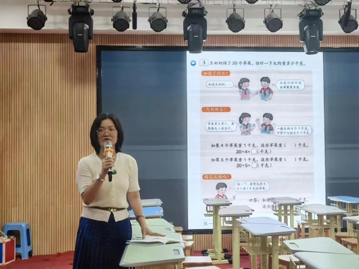 本次比賽以同課異構的形式進行,參賽的6位不同學校的青年教師同時執教二年級下冊《克和千克的解決問題》,教師準備充分,深鉆教材,精心設計教學流程,重難點突破巧妙,反復打磨,教學開展扎實高效,節節有亮點,課課益紛呈。而南頭鎮中心小學鄭斯婷老師壓軸出場,鄭斯婷老師教態自然,鎮定自若,在課堂設計當中,通過讓學生進行猜想,實踐,操作和估算的活動當中,讓學生充分地在課堂上體會到數學與生活的密切聯系,進一步讓學生建立克和千克的質量觀念,從而提高學生解決問題的能力。