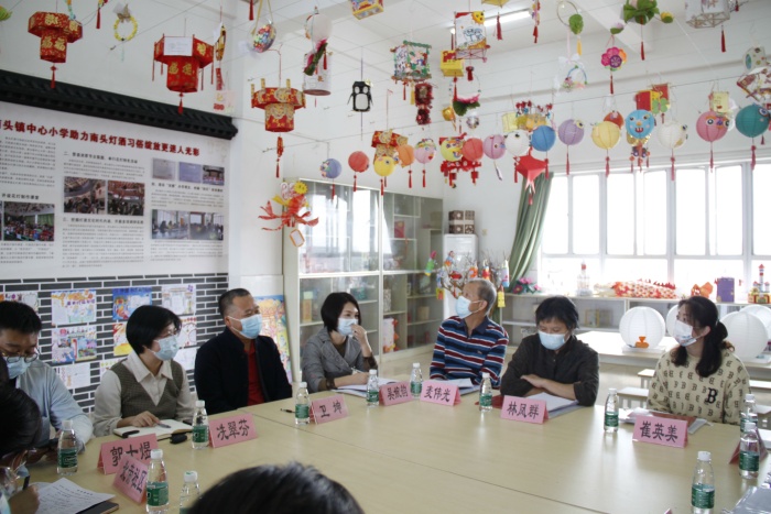 首先,在學校行政的帶領下專家組一行參觀了一樓圓盤的花燈展示、各班以“南頭燈酒習俗”為主題的廊道文化墻和燈酒文化室,精彩紛呈、各具特色的作品和布置讓專家組和領導都贊嘆不已;接著在燈酒文化室召開座談會。吳婉韻副校長代表中心小學詳細介紹學校非物質文化遺產傳承南頭燈酒文化的情況,從學校的環境設施、活動措施、傳承保障等方面列舉了中心小學的優勢,同時也簡述下一階段的傳承計劃和目標。