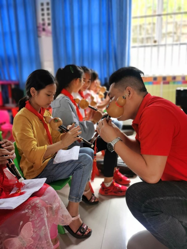 吳老師想既然來了總要留點什么下來,計劃開設學校葫蘆絲社團,并把自己的想法與校長進行溝通,由于學校經費有限,向上級領導申請,最后得到教育局吳股長的支持。孩子們雖然沒有學習過音樂知識,每個音、手型、節奏、呼吸、演奏方法等,學生們都是零基礎,這不得不讓吳老師一個音一個音,一個手指一個手指地教,短短的一周葫蘆絲學習中,孩子們基本掌握一首簡短的歌曲。除了學生,學校老師甚至校長都參加了學習,這讓吳老師非常感動。
