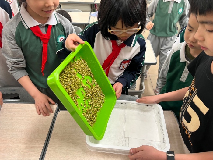 與此同時,教室里正開展《家庭小種植的方法》樂美勞動課程學習,老師們利用小視頻為同學們講解關于在家庭中種植蔬菜的好處、哪些蔬菜適合在家庭種植、如何在陽臺種植蔬菜和草莓以及家庭發綠豆芽的方法。掌握了這些種植知識后,孩子們迫不及待地從老師手中接過各種綠葉蔬菜的種子,準備回家開始自己的種植小試驗。老師們利用悅評越好平臺發布了親子種植的作業,讓孩子和家長在家一起種植,把植物生長的各階段以圖文結合的方式上傳到悅評越好,互相分享勞動的過程和收獲。