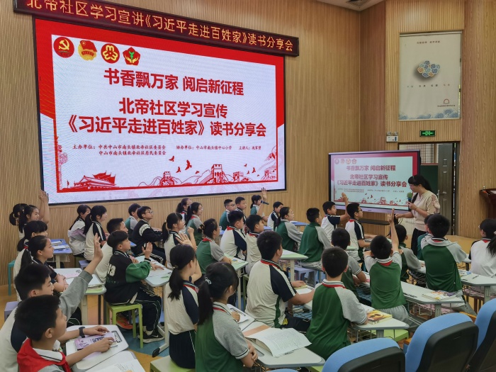 4月23日是第28個世界讀書日,由中共中山市南頭鎮(zhèn)北帝社區(qū)委員會、中山市南頭鎮(zhèn)北帝社區(qū)居民委員會主辦,南頭鎮(zhèn)中心小學承辦的“書香飄萬家 閱啟新征程”——《習近平走進百姓家》讀書分享會在學校一樓報告廳舉行,來自北帝社區(qū)黨委委員陳倩文、曾堅凡、社區(qū)工作人員出席活動,南頭鎮(zhèn)中心小學冼家碧老師執(zhí)教。