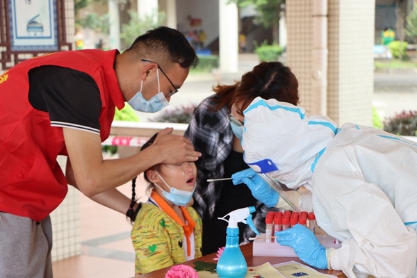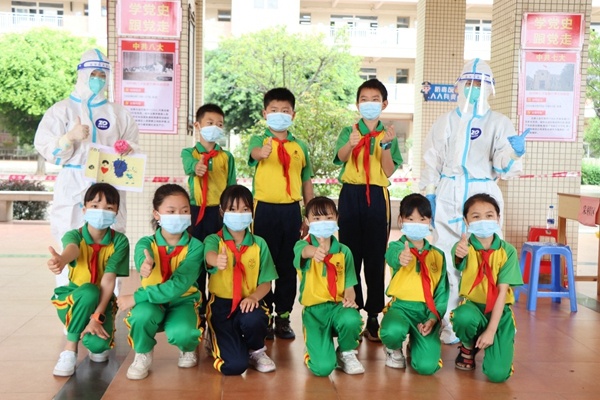 在核酸檢測現(xiàn)場,學(xué)校行政協(xié)調(diào)指揮,合理安排班級學(xué)生到達(dá)現(xiàn)場,避免人群聚集。同學(xué)們自覺佩戴口罩,在班主任的帶領(lǐng)下來到等候區(qū),間隔一米排隊(duì),有序安靜地候場。在志愿者老師幫學(xué)生掃碼錄入信息后,同學(xué)們依次進(jìn)行核酸檢測。一聲真誠的“謝謝”、一個(gè)禮貌的鞠躬,表達(dá)了孩子們對醫(yī)護(hù)人員辛勤付出的感謝與敬佩。經(jīng)過全體師生的全力以赴和全力配合,整個(gè)核酸檢測工作得以安全、有序地推進(jìn),一個(gè)早上便高效采集1266份樣品,圓滿完成校園核酸檢測工作。最后,一首《聽我說謝謝你》歌曲響徹校園,致敬負(fù)重前行、無私奉獻(xiàn)的一線防疫工作者,歌聲傳遞著孩子們感恩的心,情誼流淌在校園防疫篇章里。
