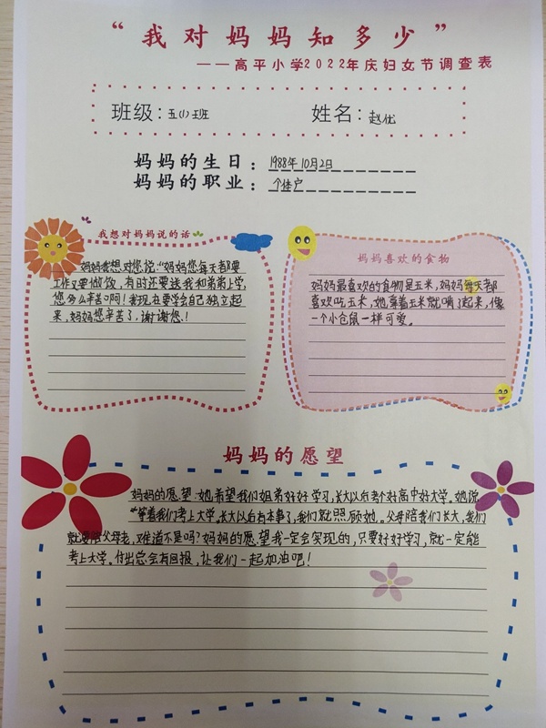 五、六年級的同學們,紛紛拿起筆,通過深入的調查,再結合平時生活的觀察,記下了媽媽的喜歡吃的食物,媽媽的愿望,還寫下了想對媽媽說話。同學們在這個過程中,加深了對媽媽的了解,也促使了同學們在今后生活中更多去關注媽媽,給予她更多的關愛。