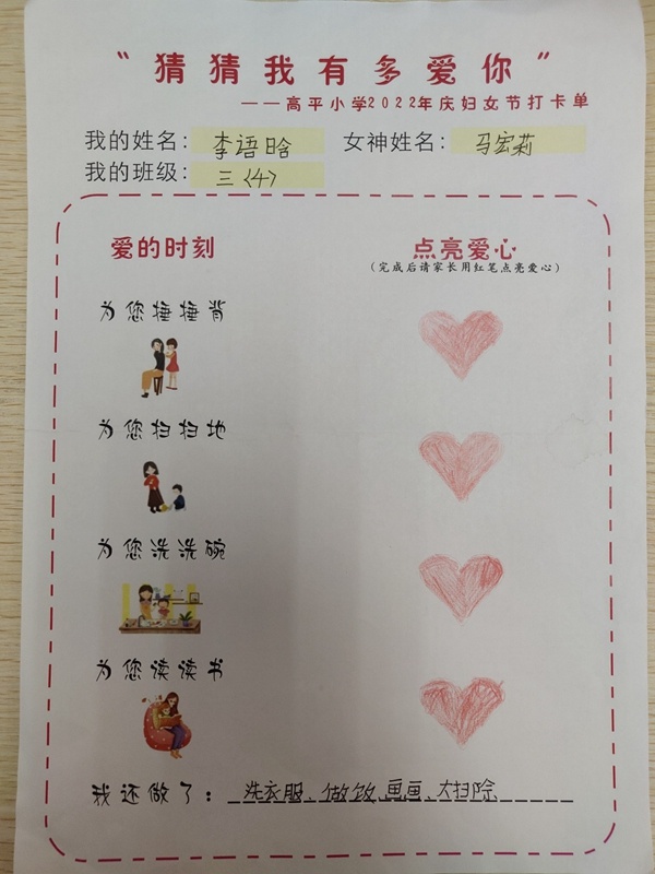 三、四年級的同學們則給家里的“女神”制造了許多的“驚喜”,打卡單滿是他們的小小計劃——推推背,掃掃地,洗洗碗,讀讀書等。每完成一項家長就“點亮愛心”。原來學會成長,就是愛你的有力證明。