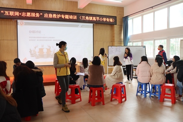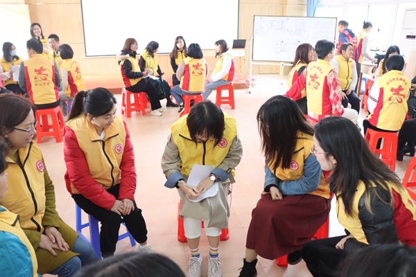 活動開始,林玉玲老師開門見山道出開展志愿服務應急能力提升培訓的目的,接著組織學員進行分組,要求在組內限時收集組員信息,并分組匯報收集成果,以此為契機,指導學員們如何收集有效信息。隨后圍繞“志愿服務中遇到什么突發事件”的核心問題,從“如何應對、哪方面是掌握得好、哪些是有待提升”等方面展開分組討論。各學員積極參與活動,紛紛上臺交流分享。最后,林老師以現場分享的事件為案例,通過生動形象的講解,規范的指導,把應急救護知識傳授給教師們。現場氣氛活躍、融洽,學員收獲滿滿。