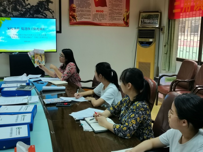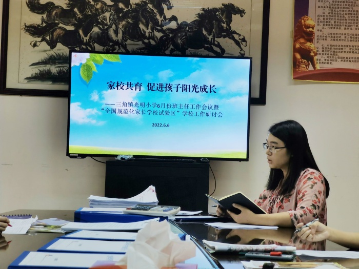 為促進學校全國規范化家長學校試驗區建設,充分發揮班主任在家庭教育中的重要作用,三角鎮光明小學于6月16日召開建設全國規范化家長學校實踐活動實驗區示范校領導小組工作會議和班主任德育研討會議。會議由德育主任林秋影主持,全體班主任參加會議。