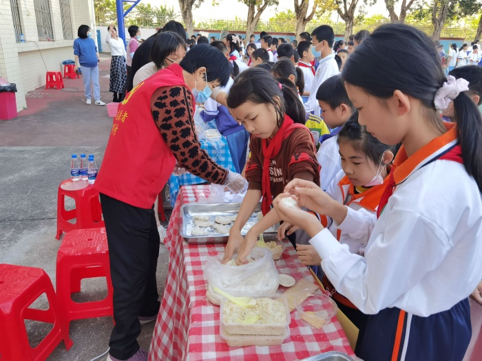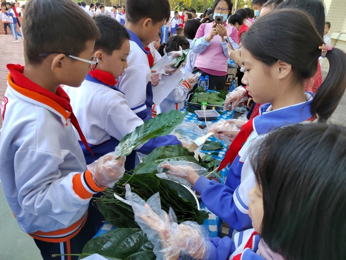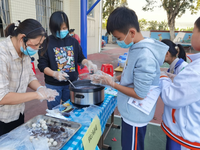 在傳統美食攤位,在老師們的帶領下,同學們將日常勞動的收獲成果轉變成全校的傳統美食共享大會。瞧,同學們大展身手,化身“小廚神”,制作出了一道道色香味俱全的傳統美食,餃子、香湯圓、茶果、冰糖葫蘆、油角、艾餅、還有三角特色美食水煮生魚等等,可謂應有盡有,令人三尺。