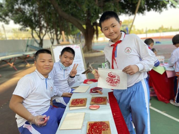 在傳統工藝攤位上,同學們圍坐一起,積極參與了陶藝、茶藝、剪紙、板畫、布染、再造紙、風箏制作、毽子制作等傳統工藝制作,場面溫馨。
