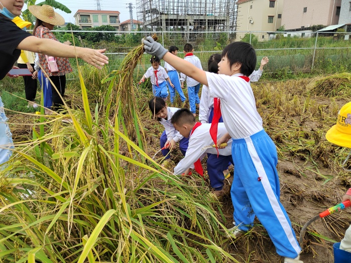在學校德育主任林秋影等老師的帶領下,同學們興高采烈地拉著家長的手來到稻田前,秋日艷陽下,滿眼金黃的稻田讓大家驚嘆不已。在割稻開始前,稻田種植人周美坤媽媽向同學們講解了割稻的技術要點及安全注意事項,示范了如何割稻,同學們很快就掌握了握禾鐮、抓禾桿、扎禾桿的基本知識,迫不及待地嘗試割稻。稻田中,同學、家長之間互相配合,有的負責割稻,有的負責捆扎,有的負責搬運,同學們收割、搬運、拾稻穗,一點都不馬虎,剛開始的時候有的同學要花很大的力氣才割下來一株,但熱情不減,很快就掌握了技術要領,熟練起來。