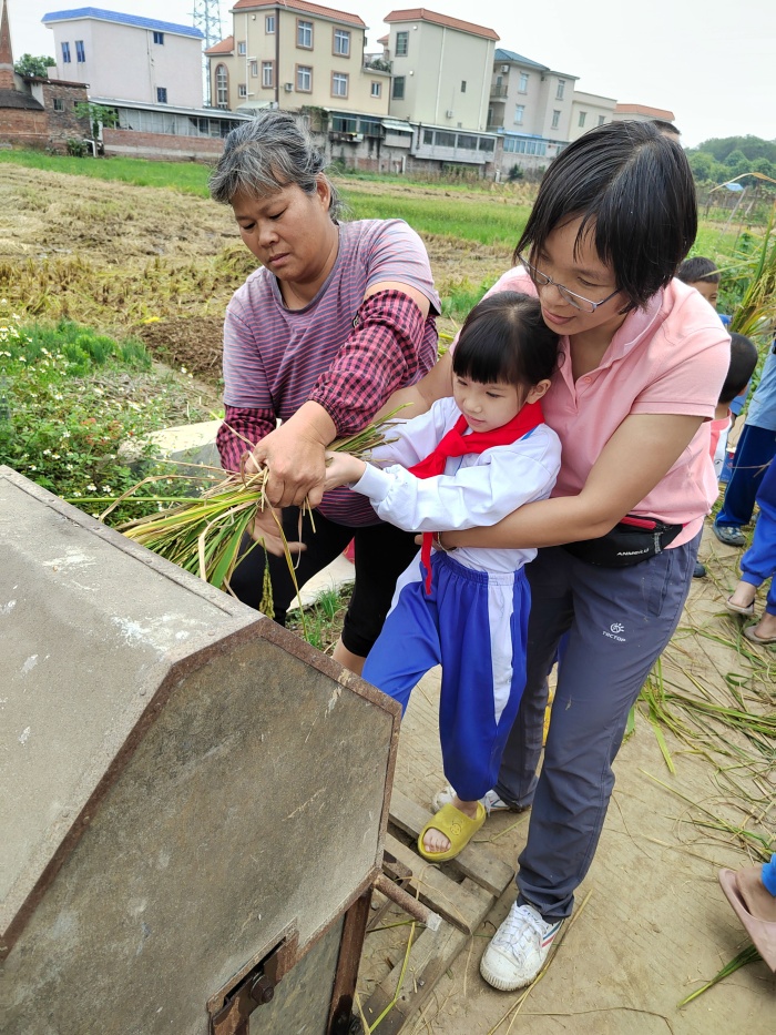 脫粒是收割稻谷過程中重要的環節。打谷脫粒機前,同學們認真觀看周媽媽示范講解打谷脫粒,了解如何對水稻進行摔打脫粒,并在家長的幫助下,拿起一把把水稻,鉚足勁摔打起來,金黃的谷粒在打谷機里跳躍起來,不一會就鋪滿了一層。