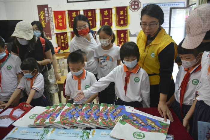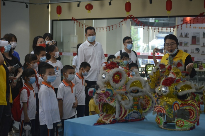 活動現場,德育主任林秋影帶領學生和家長參觀三角鎮三人根艇、麒麟舞等實物展示,學習了相關非遺知識,讓學生和家長更加深入地了解三角本地文化特色,激發學生對本土非遺項目的熱愛之情。