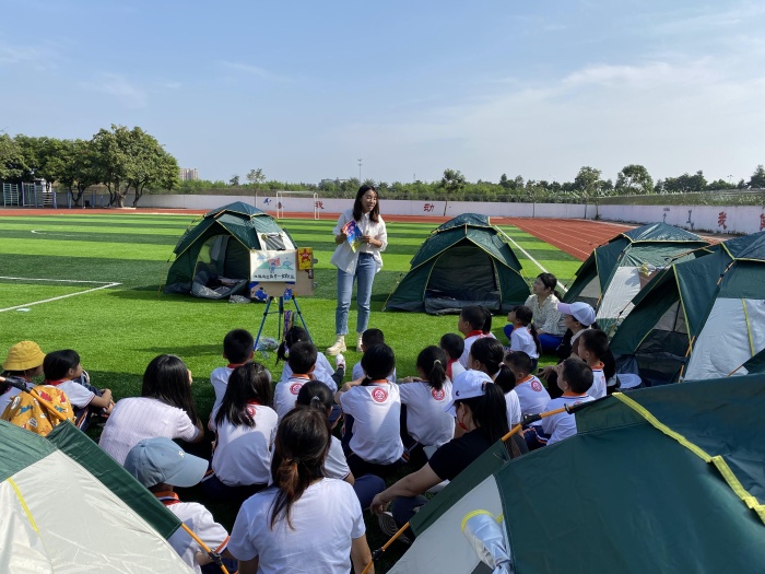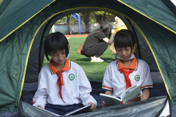 參觀結束,親子代表們一行人回到光明小學操場一起搭建帳篷,共享親子閱讀時光。有愛的爸爸媽媽耐心地和孩子們進行閱讀的畫面,一家人愛意滿滿、其樂融融的幸福場面。志愿者還給孩子們繪聲繪色地講述了《最小的紅軍》等紅色故事。瞧,孩子們聽得多認真!