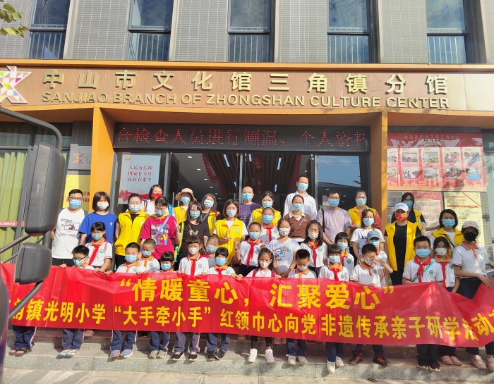 早上8點半,20對親子代表準時集中在校門口乘坐大巴前往中山市文化館三角分館。