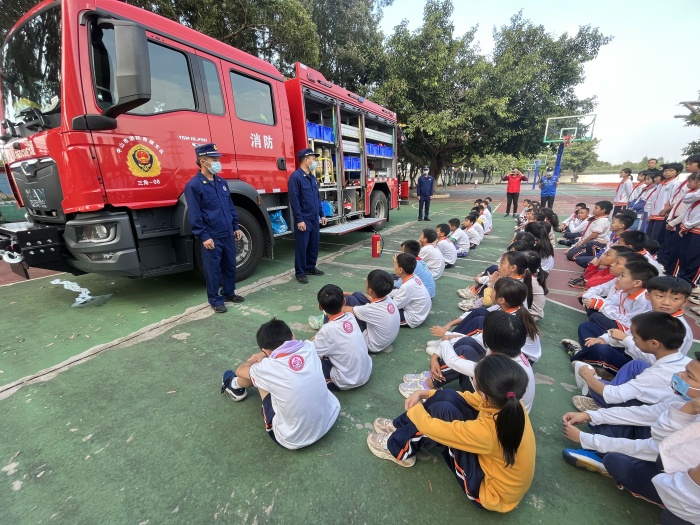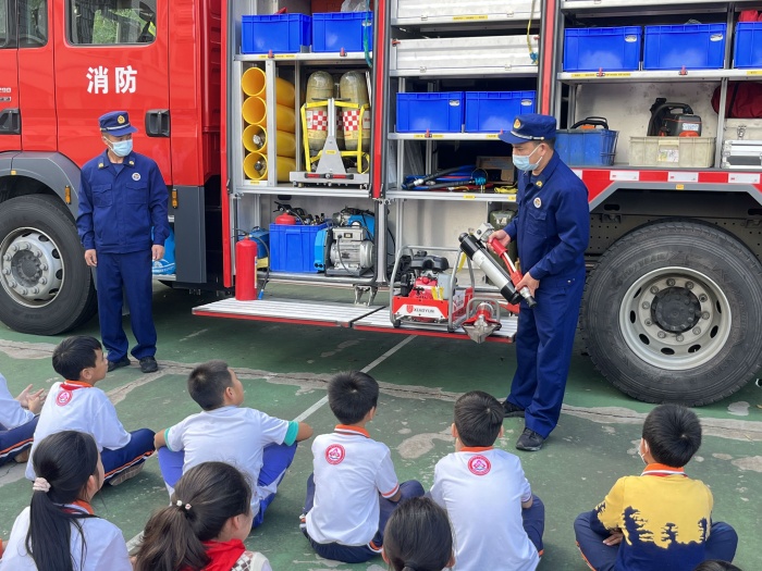 隨后,三角消防救援大隊的消防員帶領師生參觀消防車,認識了各類消防器械,學習消防安全知識和逃生自救技能。同學們在學習體驗中將消防安全知識,內化于心,外化于行。