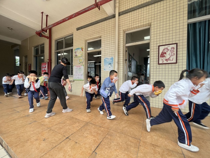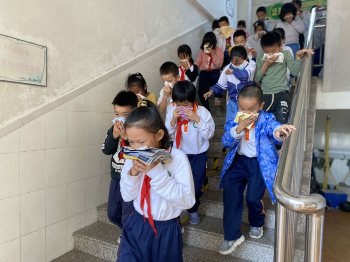 下午15:45分,隨著警報的響起,所有教職工迅速到達各班協助班主任組織學生疏散逃生。學生在老師們的指揮下,彎著腰,貓著步,用手帕、毛巾等捂住口鼻,沿著學校指定疏散路線,有序撤離到學校操場的安全地帶,耗時1分49秒。各班清點人數報告老師,全校500多名師生全部安全疏散。